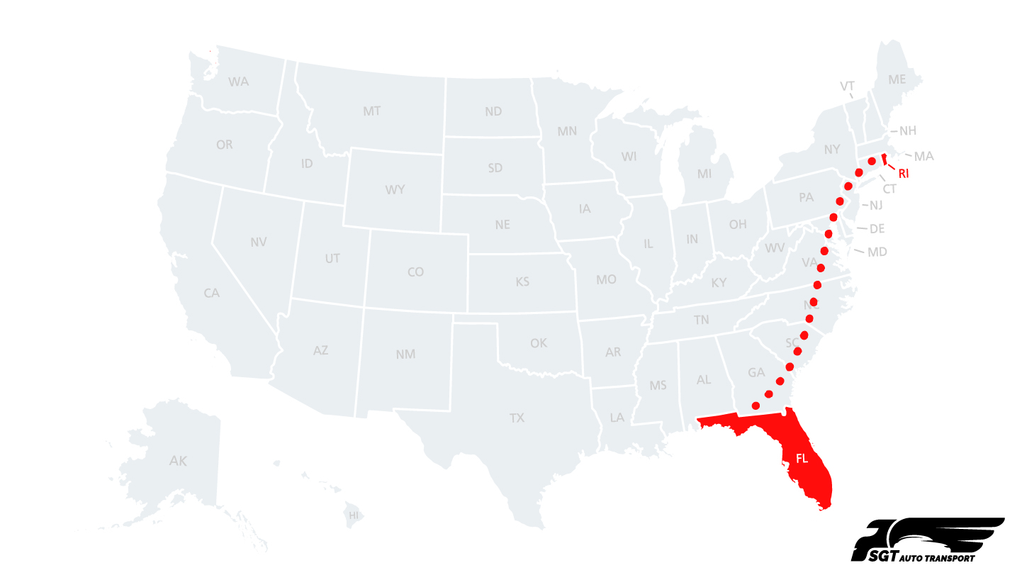 | Popular Southeast-to-Northeast Route | Florida to Rhode Island is a frequently serviced auto transport corridor connecting the Southeast with the Northeastern United States. |